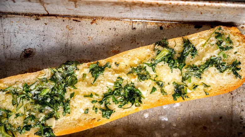 Smother the spread on the bread, bake it until its edges are crispy and the butter is golden, then scatter parmesan cheese atop it for a finishing touch. Although you can enjoy this at room temperature, it's best fresh out of the oven.