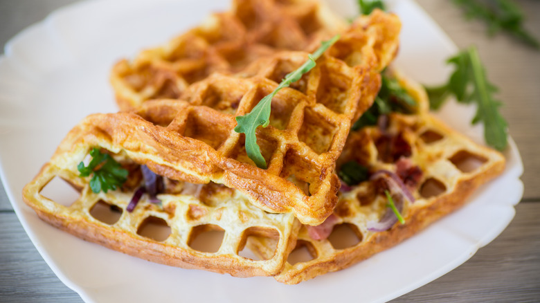 If you do want to pair those larger ingredients with your dish, set them aside to save for after your omelet waffle has cooked. You can season the eggs with just a little salt and pepper and cook the larger ingredients separately. Then, garnish the omelet waffle with them once it's out of the iron. You can then plate the waffle-shaped omelet and top it off with a savory sauce before digging in.