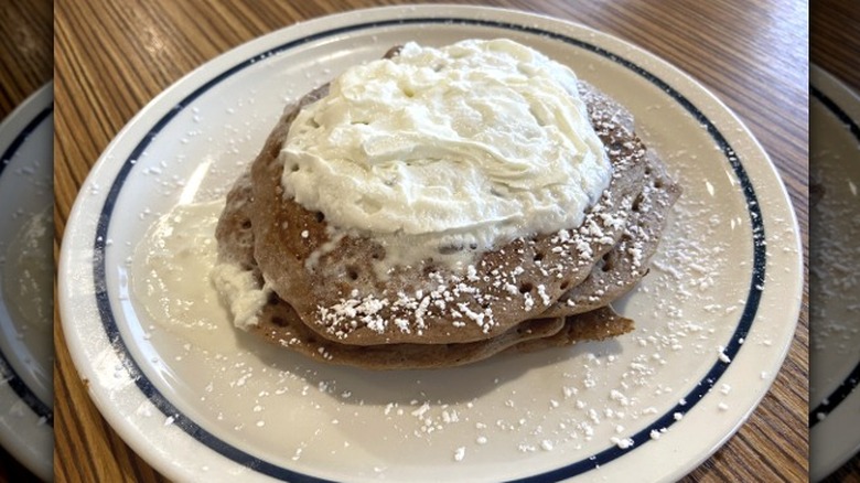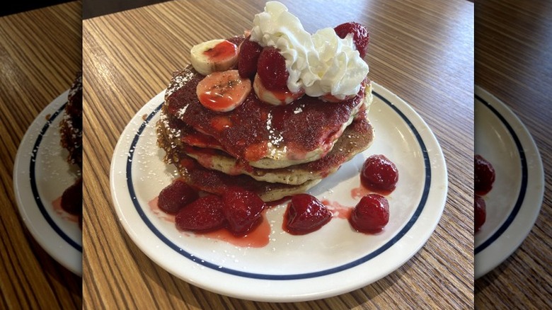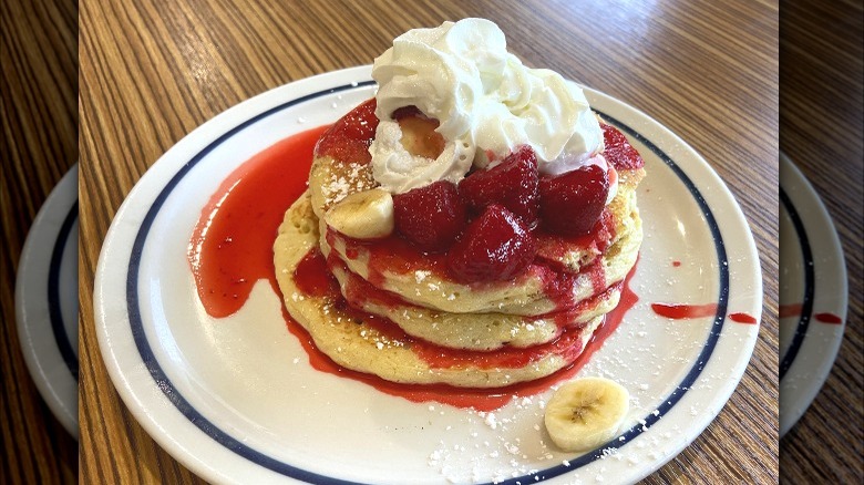 With the Strawberry Banana, we're finally entering "go for it" territory. From here on out, we had few complaints about any of the flavors we tried, though of course, some were still better than others. The Strawberry Banana is a simple option that pairs two classic fruits, layering banana slices between the pancakes and topping them with more bananas along with stewed strawberries in bright red syrup, all finished with whipped cream. As far as basics go, it's done well.