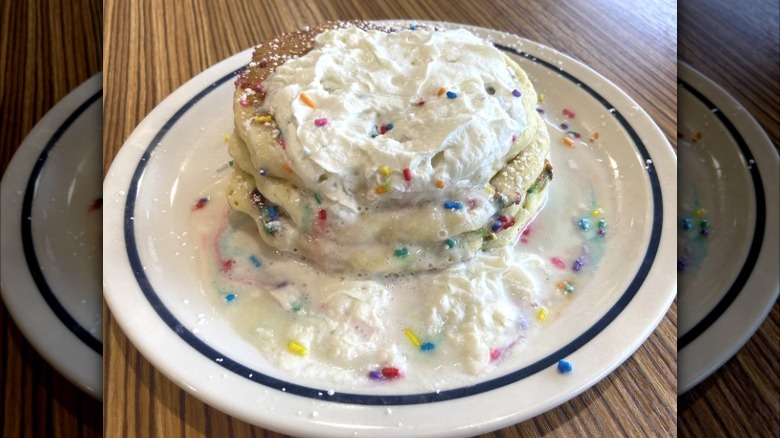 If you're looking at the IHOP Cupcake Pancakes and thinking to yourself, "Sorry, are you kidding me? Sprinkles in a pancake? Icing sauce and whipped cream? And I'm supposed to like this as an adult?" then you're not alone. This was my exact reaction, and I took the smallest possible bite on the assumption that I would be super grossed out by it. It honestly looks like somebody took a Funfetti cake and mashed it onto a cooktop, then served it up with a squirt of Reddi Wip. Like, no.