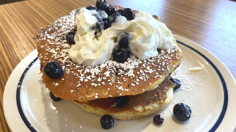 If you like blueberries, then you will almost certainly appreciate the Double Blueberry Pancakes. The tagline on the menu is "Double the blueberries, double the taste!" The double blueberry puts blueberries into the batter itself, drizzles blueberry sauce over the top, and finishes the whole thing off with that iconic baby squirt of whipped cream.