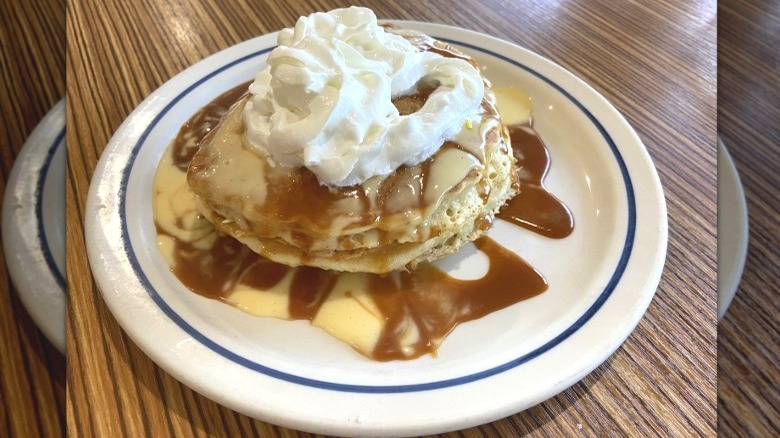 Traditional tres leches cake gets its name by virtue of the three types of milk that it uses. While recipes vary, most of them use some combination of milk, evaporated milk, and sweetened condensed milk. IHOP actually goes a different road, its dairy coming in the form of vanilla sauce, dulce de leche caramel sauce, and a whipped cream topping. Interestingly, though, when the husband couldn't figure out what flavor he was tasting in these pancakes, he posited condensed milk, so the flavors aren't that far off from the traditional.