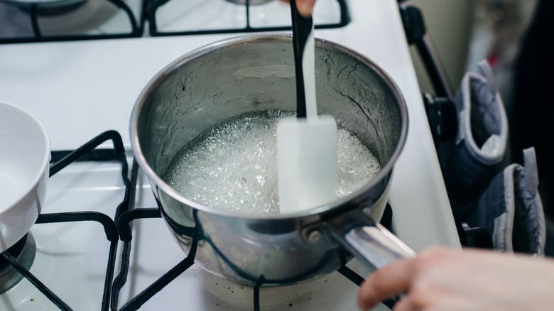 It might seem logical that stirring will prevent this from happening. But by mixing the sugar particles with the water more effectively, the opposite will occur: The sugar crystals will seek each other out and bond together, pushed by your spatula. Instead of this occurring, you should try to avoid stirring it as much as possible. If you need to mix it together or you notice that crystallization is occurring, you can give the pan a gentle swirl — but ideally, you'll leave the syrup mixture to cook without any interference.