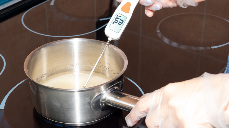 Now, if you've been making caramel your whole life, you may be able to accurately guess when your sugar has reached those temperatures — but candy thermometers take the hassle out of doing so. Try to find a thermometer with a long pen attachment so you can test the temperature without getting too close to the sugar. Finding a candy thermometer that gives accurate and speedy reads is crucial, as you may need to pull your sugar off the heat at a pretty precise moment. Some more advanced models, like the ChefAlarm thermometer, allow you to set an alarm for when the mixture reaches a specific temperature.