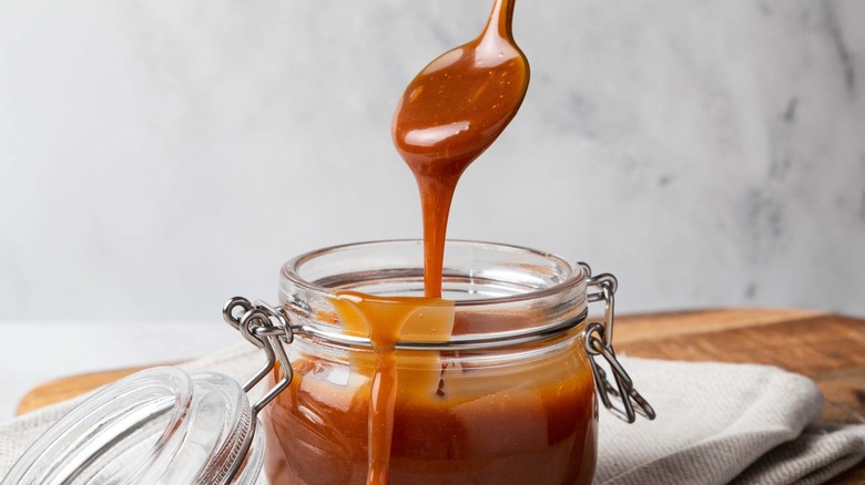 As such, you should aim to take your caramel off the heat just before you think it's finished and allow it to finish thickening up as it drops in temperature. If it's too thick after cooling, adding a small amount of heavy cream to the mixture can make it thinner. Remember, too, that if you've taken your caramel off the heat too soon and it's overly thin, it's pretty easy to make it thicker. Simply pour your caramel back into the pot, add a few tablespoons of water, and heat it back up to a simmer, allowing it to reduce further. Just remember that doing this will cause the caramel to get darker and may affect its taste.