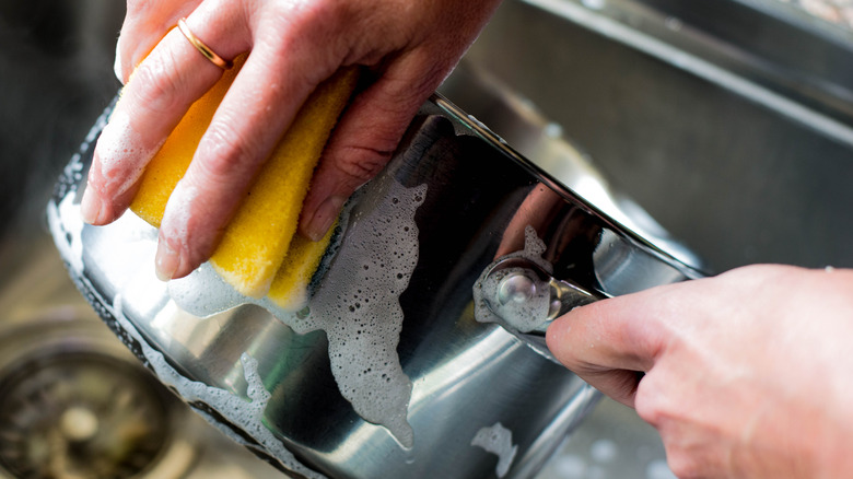 Luckily, all you need to clean a caramel-covered pan is time, heat, and plenty of soap. "Fill the sink with hot sudsy water, and immerse the pot in it and let it soak and cool a bit," recommends Good Housekeeping Research Institute Cleaning Lab director Carolyn Forte, per Good Housekeeping. "Wearing rubber gloves, I'd try to remove as much of the caramel as I could as the water softens it." If you need to, you should decant your water and replace it with a fresh, hot batch, repeating until all of the sugar has softened and begun to dissolve. Then, once the sugar has all gone, simply scrub your pot as you normally would, dry, and stash away until the next time you make caramel.