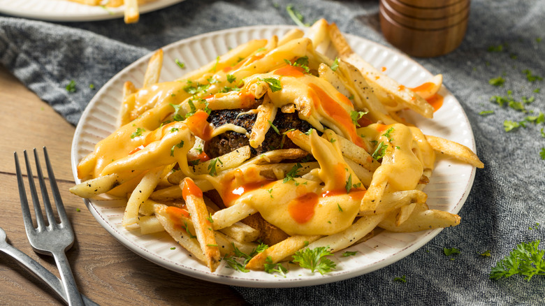 The dish gets its name from the shape of the original cut of ham used for this open-faced sandwich. The ham was placed atop toasted bread, doused with a liberal serving of a cheese sauce, and garnished with roasted potato slices intended to represent the nails in a horseshoe. Today, the potatoes have been replaced with french fries, and the ham is often substituted with hamburger patties. The secret weapon is still the unctuous cheesy sauce.