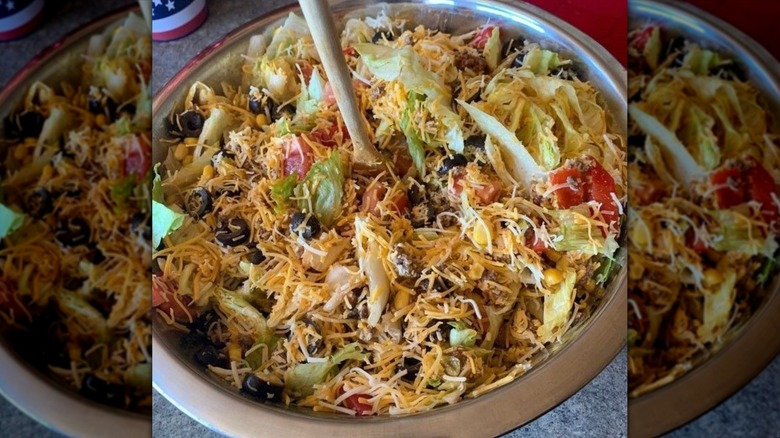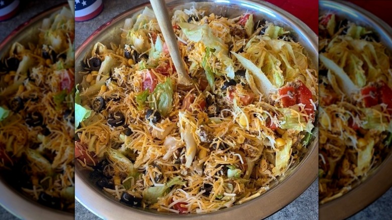 Once the main ingredients are assembled, the whole thing is tossed together with Catalina or Western dressing, giving the dish a tangy, zippy kick. While some people like to change things up using different flavored Doritos or adding items like beans, guacamole, and salsa, these are not traditional and might just start a riot at any Midwestern block party. It's hard to argue with a classic that delivers just the right balance of crunch, salt, spice, acid, and even more salt.