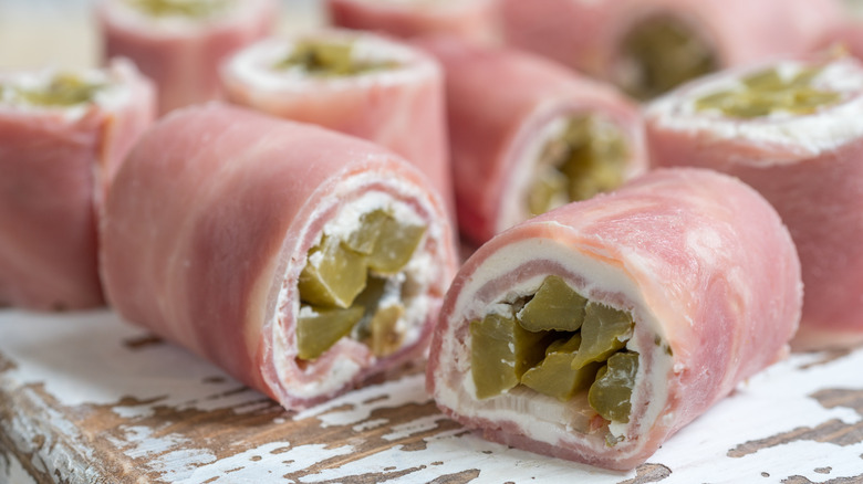 The basic recipe is simple. Schmear cream cheese over a dill pickle, wrap it in ham and slice it into chunks. There are several variations of this theme. Some envelop the ham in a tortilla. Others add different kinds of meat or cheese. And still, others combine all the ingredients into a dip, which defeats the purpose of the whole sushi theme if you ask us.