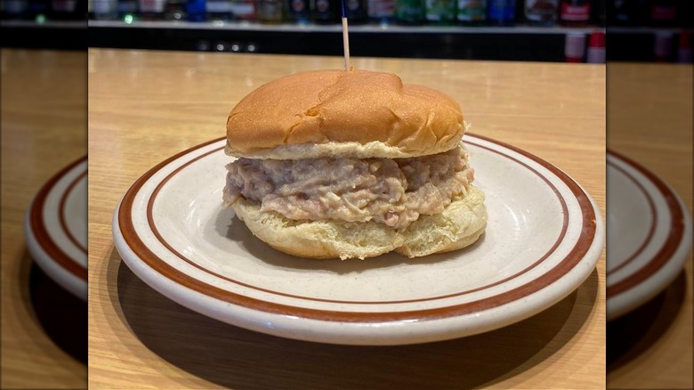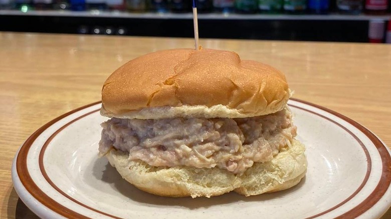 Though recipes differ and secret ingredients abound, commonalities include chicken stewed for hours in canned cream of chicken soup, with poultry seasoning and crumbled Ruffles potato chips. We admit to having some skepticism about this dish. When the shredded chicken gets heaped atop a sandwich roll or hamburger bun, the result is salty, rich, and delicious. For an unorthodox twist, try garnishing with pickled jalapeños or pepperoncini.