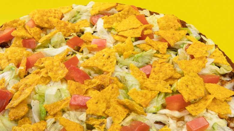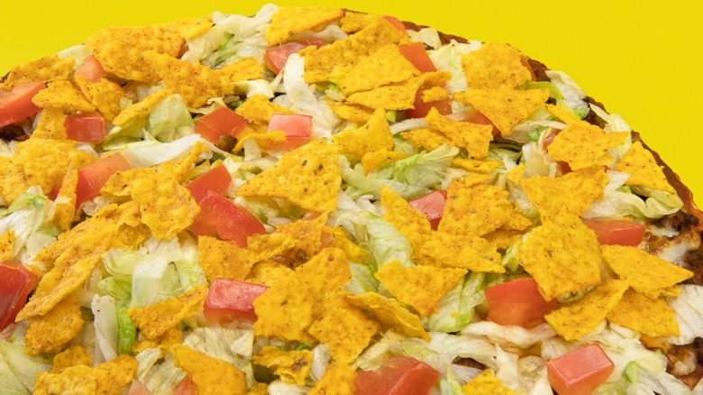 The pizza begins with tomato paste and a thin layer of refried beans. This is followed by cheese, a ground beef and sausage blend, tomatoes, and lettuce. The pièce de résistance is the topping, a proprietary recipe for a nacho-flavored taco chip that gets crumbled up before adorning the pizza, providing just the right amount of crunch over the gooey layers of toppings underneath it.
