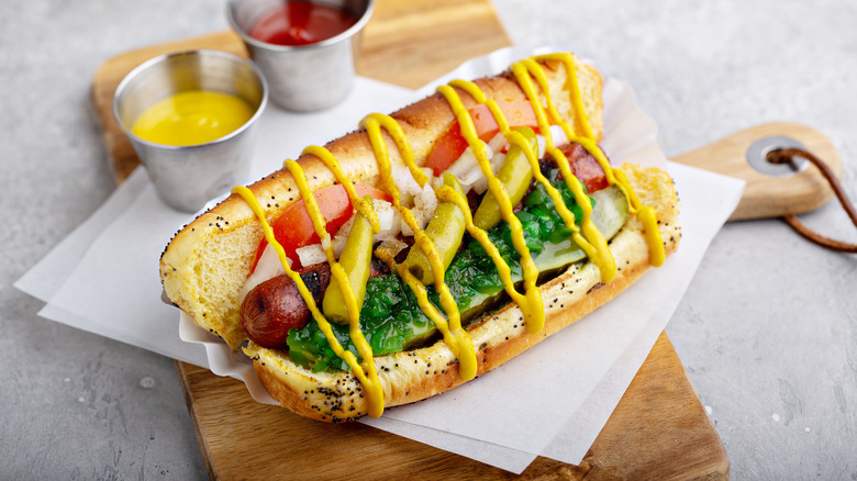 The preferred bun is a poppyseed-coated delight known as Rosen's. These squishy buns are always steamed, never toasted. Finally, the right blend and proportions of toppings are a must. Chicago-style dogs always contain sport peppers, yellow mustard, pickle, onion, tomato, celery salt, and neon green relish that seems unsafe to eat but is quite delicious. Whatever you do, never ask for ketchup on your dog in Chicago, as it is a cardinal sin.