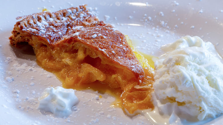 Featuring a double pie crust, the custard-like filling of this dessert features whole, sliced lemons. These are macerated in sugar to help eliminate some of their tartness before being combined with the egg custard and baked. The result is a filling that is something of a cross between a classic lemon curd and lemon marmalade.