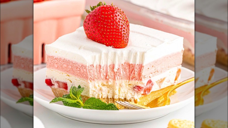 Also known as strawberry dream, strawberry yum yum, and strawberry cheesecake lush, strawberry delight is a dessert of unknown origin that is extremely popular across the Midwest. This no-bake summer classic is a cross between a strawberry cheesecake and a strawberry shortcake, with a twist. Like many Midwestern desserts, gelatin is a key ingredient, giving this dessert a creamy texture and vibrant pink hue.