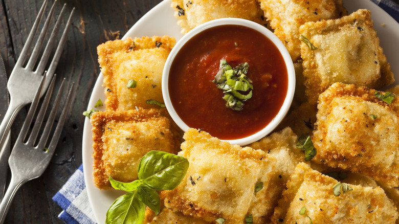Though toasted ravioli can now be found in restaurants across the U.S. in some parts of the Midwest, like pockets of Central Illinois, they are a staple comfort food accompaniment to fried chicken. To confuse matters even further, the terms ravioli, ravs, and tortellini ravioli are often used interchangeably, and you never know whether you will actually get square ravioli or tortellini.