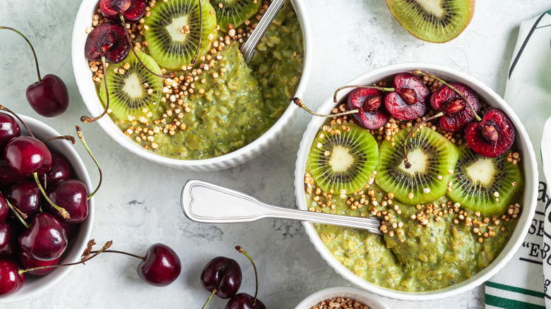 For added sweetness and depth, drizzle honey or maple syrup, and sprinkle toasted sesame seeds for a nutty contrast. This unique combination not only transforms your oatmeal into a visually stunning vibrant green but also elevates your breakfast into a peace-promoting treat.