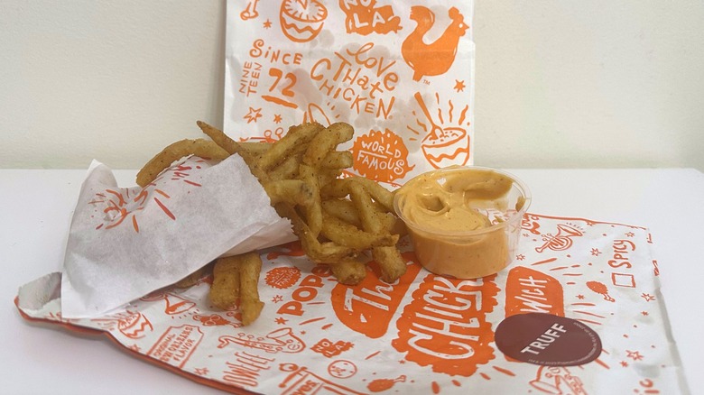 When it comes to the TRUFF items, you can order any of them in the store, but only the sandwiches are shown on the menu. The expanded "Build Your Own" TRUFF menu is available by ordering on the Popeyes website or via the app. Here, you can pair pretty much every menu item with a side of TRUFF sauce for an upcharge of $1. Of course, you can always just ask for an extra side of sauce. This is what we ultimately had to do to get our side of spicy mayo that was supposed to be served with the fries.