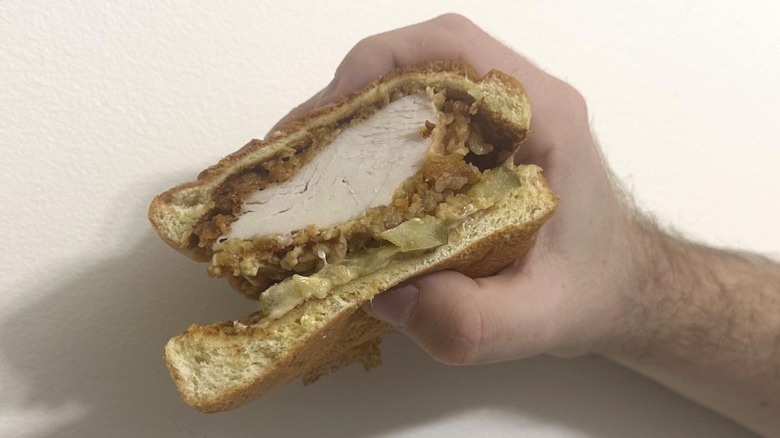 There was a light spread of the truffle mayo on both the top and the bottom bun; however, it was not enough to stand up to the flavor of the massive fried chicken breast and juicy pickles the sandwich is known for. Basically, this tastes like a regular spicy Popeyes chicken sandwich, which is to say it's not even that spicy. The umami you expect from the truffle only rears its head faintly every few bites. On its own, we are not quite sure if paying for this over a regular sandwich is even worth it. However, we did find a way to improve it.