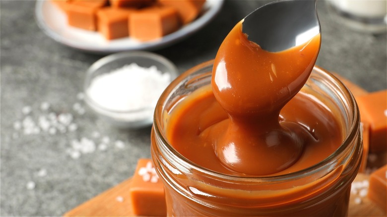 If you're intrigued by imbuing your classic vanilla whipped cream recipe with caramel, first you need to follow the steps to make your own homemade caramel sauce. The first step is to make the essential base of this sweet treat topping: a golden brown sugary syrup. To do so heat sugar, salt, and water in a saucepan over medium heat. Using a saucepan with a heavy base helps maintain consistency in the heating process. Once your sugar mixture smells of buttery caramel and turns a rich tan color, remove from heat and slowly add in the cream. From here, all you need to do is incorporate some butter, stir the mixture well, and pour the caramel sauce into a clean jar.