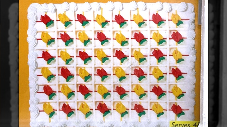 So, what exactly is a scored sheet cake? It means the serving squares are already thoughtfully marked out for you. That means no more awkward attempts at cutting straight lines or worrying about portion sizes. This convenience alone can save you plenty of time and effort, making your event a breeze to manage. But Costco's attention to detail doesn't stop at just scoring the cake. You have the option to request that the bakery team decorate the cake with a frosting flower on each square. This isn't just about aesthetics — it's a practical touch that ensures every guest gets the exact same delectable slice, decorations, and amount of icing. No more fighting over pieces with more icing or uneven servings. It's an elegant and thoughtful addition to your event that adds a touch of sophistication to your celebration, without adding any extra hassle.