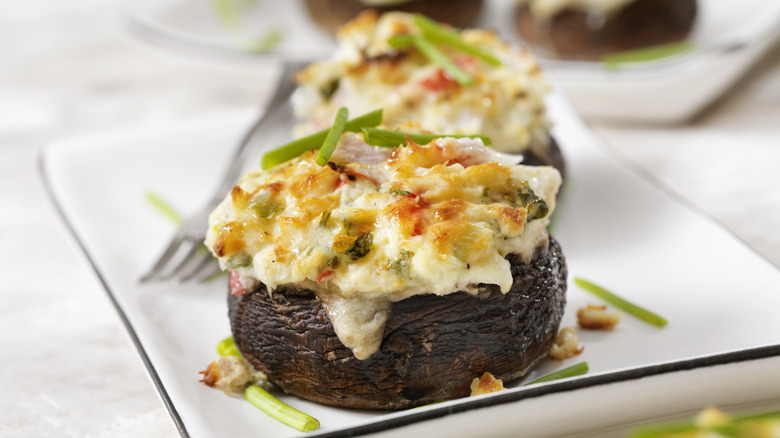 Also, include a cheese such as mozzarella or parmesan and a creamy component like mayonnaise or cream cheese. After you fill the mushrooms, bake them until they're tender and the stuffing is bubbly. It's a similar approach when you make stuffed peppers, except they can work as an entrée. In that case, you can incorporate more elements, like shrimp, onions, garlic, celery, or even Italian sausage.