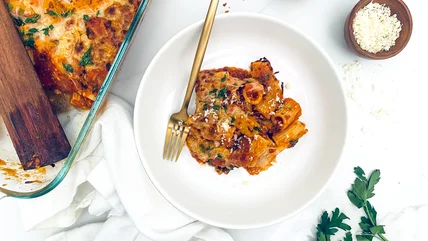 This pizza pasta is Italian-inspired, so Vergara tells us, "I like to serve this with a green salad and garlic bread." Conveniently, both of these sides can be thrown together pretty quickly while the pasta is in the oven.