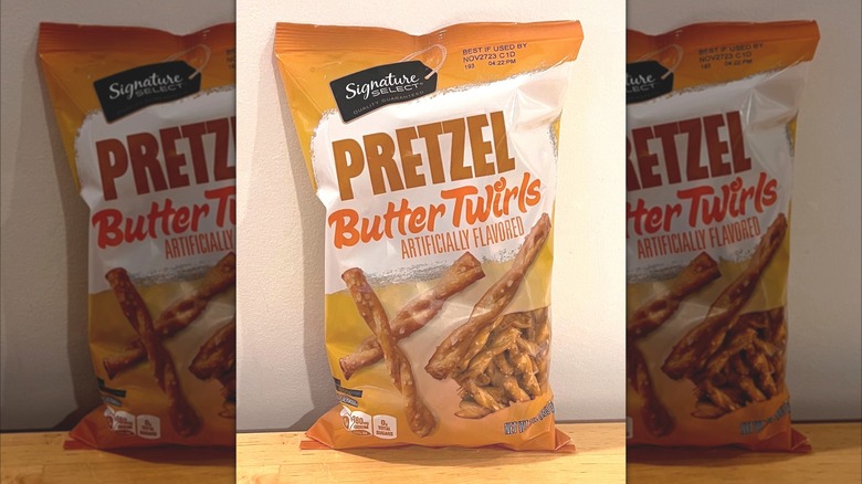 Signature Select's Pretzel Butter Twirls left us with an unfortunate taste experience, ranking at the very bottom of our list. We don't know what was going on with these pretzels, but the smell alone made us want to forgo the endeavor. Right off the bat, the scent wafting from the bag was peculiar, reminiscent of suntan lotion rather than a tantalizing snack. As we took our first bite, our disappointment only grew.