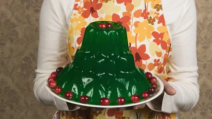 You're not going to submerge the entire thing, either. Only the sides should be dipped in the warm water; be sure to keep the actual gelatin nice and dry. Then give it a little jiggle, top it with a cold plate, and flip it over. Ta-da — your masterpiece will be set free from its mold.