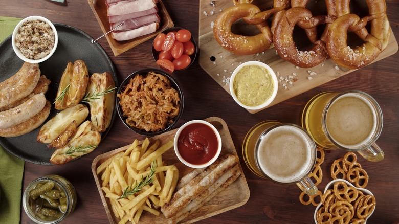 As this is a German-style pickle, it's best to start by brainstorming what other German foods would work best for a charcuterie board. As previously mentioned, a spicy stone-ground mustard paired with a few varieties of salted pretzels could be a good place to start. Apples are another popular offering in Germany, so adding some slices of Granny Smith on the side could offer a colorful pop to this charcuterie board, too. Some simple aged cheeses and sausages, such as warm bratwurst and a buttery gouda, could fill in some of those other spaces.