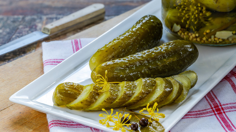 In one Reddit post, a fan praised the crunchy texture and complex flavors of these pickles, paying special attention to the prominent notes of pepper and garlic. Other fans took to Facebook to explain just how much different these pickles are from others they've had. One user described the Deutsche Küche offering as "thin-skinned gherkin cucumbers [that] are less vinegary than typical American-style dills, and less dilly as well." They also described the pickles as being slightly sweet — but much less so than bread-and-butter varieties.