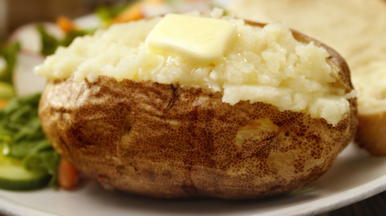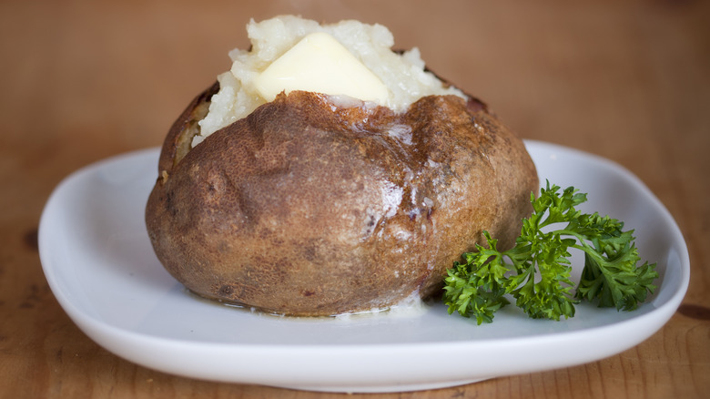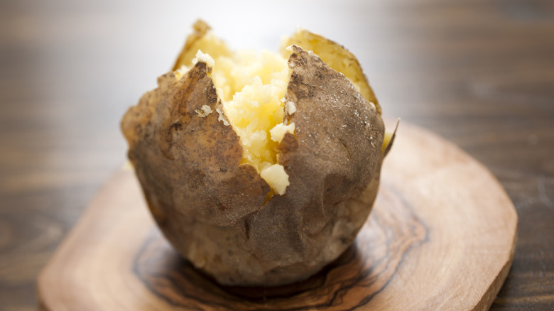 Depending on what appliances you have in your kitchen, there are a few ways to reinvigorate leftover baked potatoes. The best method out of all, however, is in a conventional oven — doing so results in the most tender interior, preventing the potato from drying out, while still crisping up the exterior. Place the spud directly onto a baking sheet and bake at 350 degrees Fahrenheit for just 15 to 20 minutes to get the job done, leaving you with a perfectly presentable dish. With this method, you can even bake potatoes in large batches ahead of time and reheat them, saving time and reducing stress for weeknight dinners.