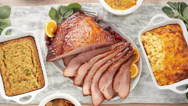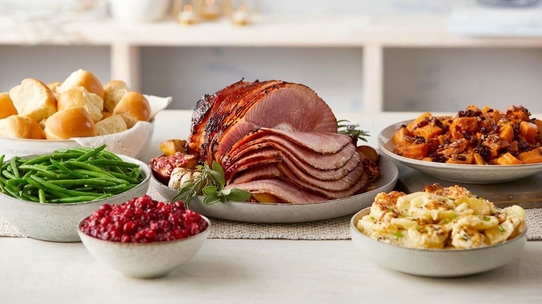 The Holiday Ham Meal serves 8-10 people and costs $99.99 plus tax. It includes a 9-pound spiral-sliced bone-in ham, scalloped potatoes, green beans, roasted butternut squash, cranberry relish, and dinner rolls.