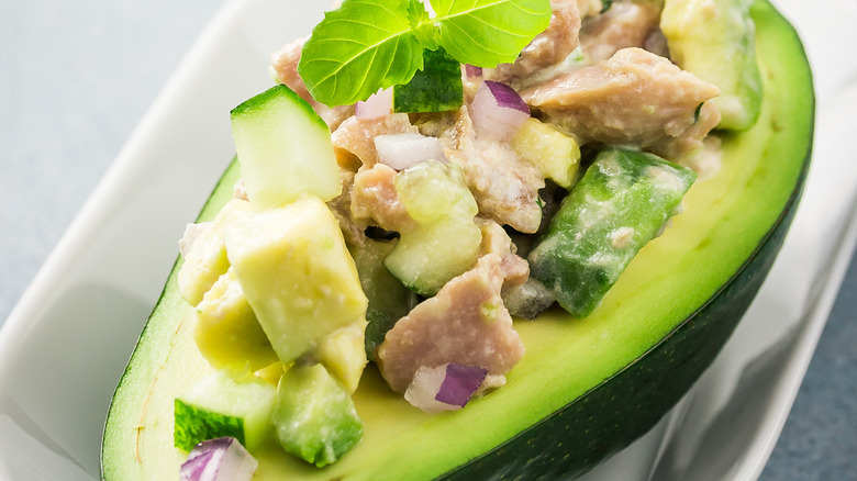 While you certainly can make the same old tuna salad to put inside your avocado halves, there's a good chance you may be inspired to switch your standard recipe up a little bit. The creamy, green non-veggie (they're berries) goes so well with lime and cilantro that you can't go wrong with adding both to tuna salad. Or, consider squeezing the lime juice directly onto the avocado and garnishing the whole thing with cilantro. This would also be the perfect time to break out some zesty lime-flavored mayo.