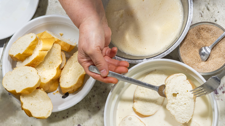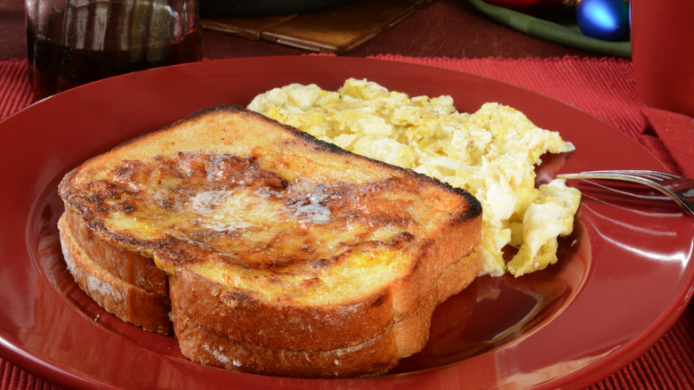 There's an eggnog French toast for everyone – even vegans. This may seem counterintuitive; after all, "egg" is in the name. But there are plenty of vegan eggnog-like beverages you can use to get in on the holiday drink. One Redditor said their vegan eggnog French toast turned out great with a simple store-bought variety. People who want to avoid alcohol in their food can also enjoy eggnog French toast just fine as long you double-check the ingredient list for hidden alcohol.