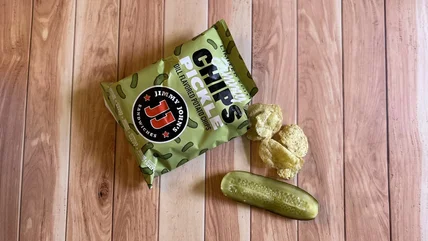 At Jimmy John's, the shelf that displays the chain's selection of house Jimmy Chips, most of the bags are metallic black, adorned with the iconic JJ logo, and with colorful bold text differentiating one from the next. Looking camouflaged with its earth-toned hues — and yet standing out like a sore green thumb — the Pickle Jimmy Chips calls out to be grabbed.