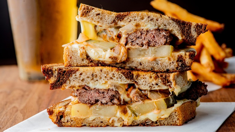 "What's a burger?" seems like an easy question. A burger is a freshly cooked patty (usually beef) between two buns, often with cheese, lettuce, tomatoes, onions, and condiments. Of course, you've got many ingredients you can add for creative burger hacks, and there are plenty of vegan or vegetarian options, but burgers are easy to recognize. But asking about a patty melt complicates things because it's so similar. It's not quite the same thing, though.