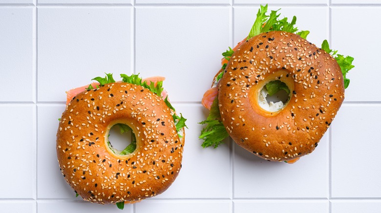 According to the internet, the way one prepares and enjoys a bagel is serious business. Recently, a TikTok went viral featuring an LA native visiting New York and asking for a "scooped" bagel. Viewers quickly turned on the tourist who was looking to rip out the contents of a perfectly good bagel to make way for more cream cheese and toppings. While many were shocked that this method of removing the inside of a bagel even exists, the TikToker's dilemma does ring true to fans of a bagel sandwich. While a dense, delicious bagel can make for an incredibly enjoyable eating experience, oftentimes the slippery contents of your sandwich will fall out due to the thick dough. Fortunately for bagel sandwich fans, there are other techniques for optimizing the contents of your sandwich without resorting to the unpopular "scooping" method.