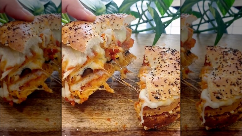 Most people know pizza bagels as the bite-sized toaster oven treat you can find in the frozen aisles of the grocery store. Or, maybe you've eaten your fair share of makeshift personal pizzas made on a bagel cut in half when you were craving a taste of cheese and pepperoni and there was no other pizza crust readily available. But TikToker @foodforthought1 totally changed the game by using the bagel-slicing hack to make a layered pizza bagel that balances the ratio of sauce, cheese, and hearty bagel dough. They begin by slicing an everything bagel into four slices and adding sauce, cheese, and various veggies to three of the four layers (leaving the very top bagel for the end). The bagel layers are baked and then stacked on top of each other, reconstructing the form of a bagel. A stacked pizza bagel sandwich is a brilliant way to enjoy all of that delicious dough without any toppings spilling off the top or out the sides of your baked good.