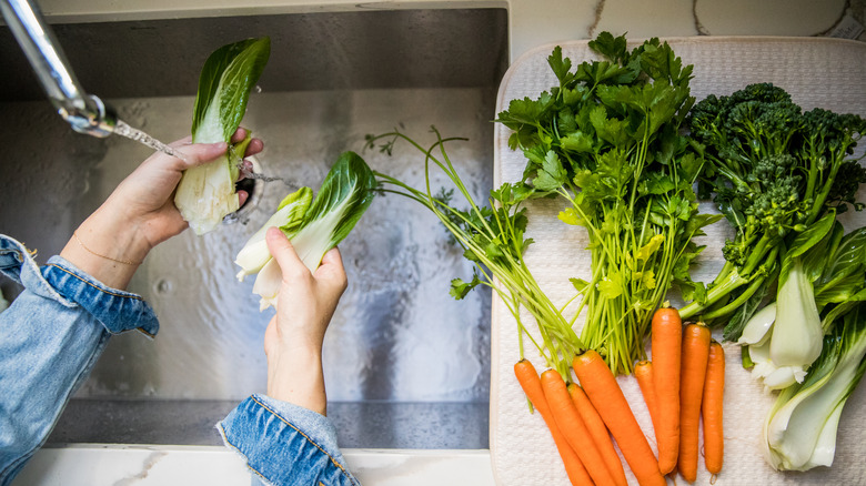 We'll be the first to say that food poisoning and consuming dirty produce is worth the concern. However, washing and cleaning your baby bok choy is as simple as eating it, so there's no need to overcomplicate it. Sure, expensive veggie wash, lightly salted water, and vinegar-water solutions can clean your produce well, but good old-fashioned tap water will take care of washing away any impurities, debris, pesticides, and tiny little pests that might be stuck to your baby bok choy. Whichever way you choose to wash it, there are some cleaning methods you should always avoid.