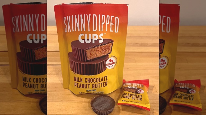 Sometimes with "health-conscious" candy, there is a weird flavor in the mix that replaces the sweet kiss of sugar. However, that's not the case with Skinny Dipped Cups Milk Chocolate Style Peanut Butter. Crafted with a health-conscious mindset, these cups proudly tout their non-GMO, keto-friendly, and gluten-free attributes, along with a notable woman-founded heritage. But, when it comes to taste, that's where the party parade stops.