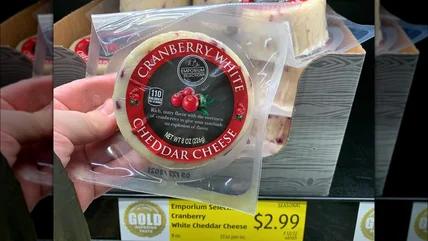 The holidays are getting close, which means there's a lot of planning, shopping, and cooking to do. Chances are you're going to end up hosting or attending an avalanche of seasonal cookie swaps, secret Santa parties, office gatherings, and open houses, and you don't want to show up everywhere with the same old boring cheese ball. But party food gets expensive, which is why Aldi is a great place to stock up on special occasion snacks that will keep your budget in check. This year, if you find yourself searching for deals at the German-based discount grocery store to feed all the hungry carolers and coworkers in your life, keep an eye out for its fan-favorite Emporium Selection Cranberry White Cheddar cheese.