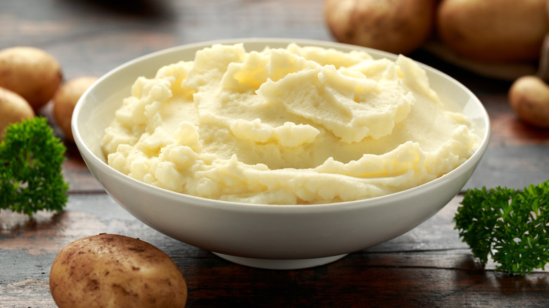 The slow cooker is a great method if you're preparing the potatoes the day of, but what if you need to cook them the day before? In this case, you'll need to refrigerate them, but that doesn't mean you have to sacrifice texture. The trick here is to always add more butter and cream than you actually need. Make sure the mashed potatoes are super creamy (almost to the point of a thick sauce). Then, refrigerate them, and when you're ready to warm them up, just reheat them in a 350-degree Fahrenheit oven, and they'll turn out just as fluffy as if they were made that day. Don't hesitate to add a little more butter before reheating, too.