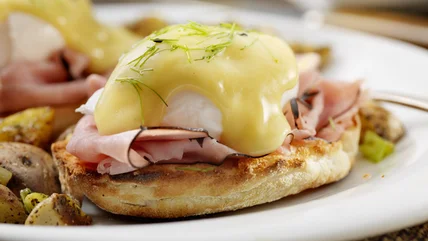 Of course, topping slices of the casserole with Hollandaise sauce is essential for giving each bite that eggs Benedict taste. Hollandaise sauce is typically made from slow-cooking egg yolks and lemon juice, with melted butter drizzled in. You can also add your desired seasonings to enhance the flavor to your particular tastes.