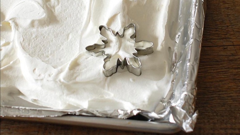 All you need to make your floaters are Cool Whip, a sleek spatula, a baking sheet, aluminum foil, cookie cutters, and your freezer. Get holiday-themed cookie cutters that evoke the spirit of the holidays with their shapes such as a snowflake, snowman, stocking, or candy cane. You should also clear out some room in your freezer so all of your floaters can fit when it's time for you to store them (more on that later). It's also best to make your floaters the night before your holiday guests arrive. Now that you're prepared, you can start making your Cool Whip floaters.