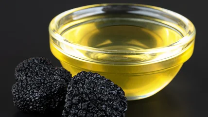 Truffle oil is made simply by infusing pieces of fresh truffle in oil for some time and straining the truffle away to leave the flavored oil behind. You can buy many varieties of commercially made truffle oil, including bottles made from white truffles and black truffles. White truffles are typically more expensive and have a lighter aroma with notes of onion and garlic. Black truffles have earthier aromatics, and oils made with black truffles are a little stronger flavored. Keep this in mind when you're flavoring your popcorn, and only use a couple of drops.