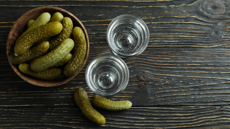 In this case, the answer is a very loud yes. Moonshine pickles are exactly as their name implies — pickles soaked in a jar of moonshine. Not only are moonshine pickles indeed made with moonshine, but the alcohol isn't cooked out or otherwise neutralized, so these pickles pack a punch. There are a handful of brands that commercially produce moonshine pickles, and these tend to hover between 20-30% alcohol by volume. (For reference, most straight spirits are about 40% ABV.) So, yeah, this is one treat you won't want to share with the kids.
