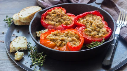 When you think of a stuffed pepper recipe, you probably think of the Mexican-style dish with ground beef, hot peppers, beans, and rice, among other ingredients. Traditional stuffed bell peppers are often topped with a sprinkle of shredded cheese, and you might find some cheese in the filling, too. However, stuffed peppers are perhaps more versatile than you think; they provide a great low-carb alternative to a typical sandwich or melt. The bell pepper replaces the bread, and the interior can be filled however you want. For a low-carb, high-protein lunch, try replacing the traditional filling ingredients with items you'd use in a tuna melt.