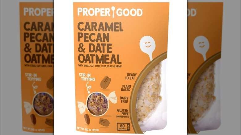 Proper Good's Caramel Pecan & Date oatmeal is different from the other oatmeals on this list. Rather than coming packaged with all of the ingredients premixed together, this oatmeal comes with a separate pouch of flavored toppings that's added after the oatmeal has been warmed up. The oatmeal mix itself contains ingredients chia seeds and hemp seeds, which are healthy ingredients. The issue here is with the accompanying flavor packet.