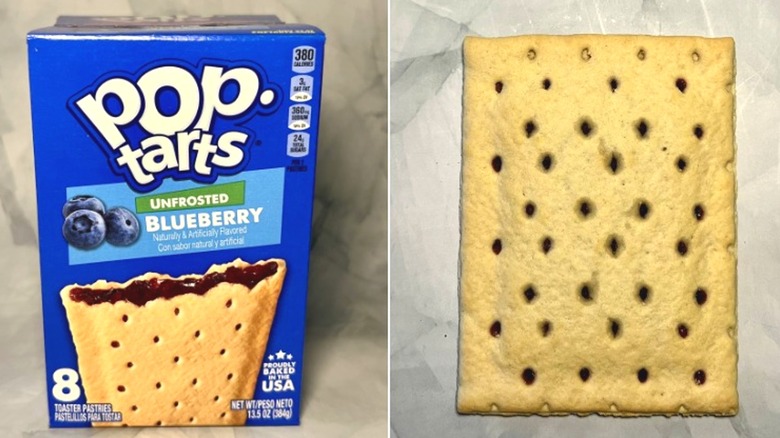 Frosted Blueberry Pop-Tarts is super solid flavor. So what happens when its sugary coating is stripped away? What taste remains behind? When you don't have that white glaze to gaze at, there's not much of anything appealing in terms of looks. All you see is a series of strawberry seed-shaped holes, and a hint of a darkened color behind them. Taking a whiff of this one mainly highlights the pastry shell's breadiness, with maybe a vague hint of the filling within.