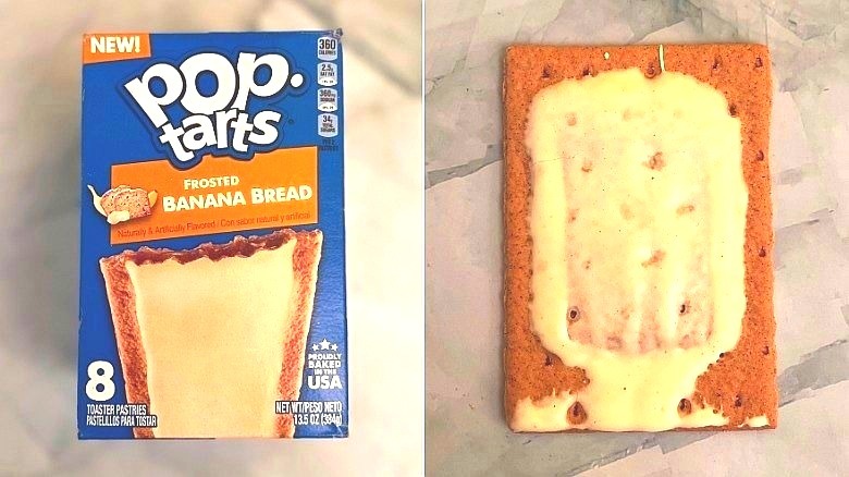 Molasses, cinnamon, ginger, and banana powder, but no actual bananas, are under the hood of the Frosted Banana Bread Pop-Tarts, which debuted in the spring of 2023. A grainy brown Pop-Tart is covered in what could be banana cream, but when you actually take a taste of this one, which the company said in a press release was a "delicious short-cut to fan favorite nostalgic and comforting flavor," it turns out to be something not very memorable, or one to cozy up with.